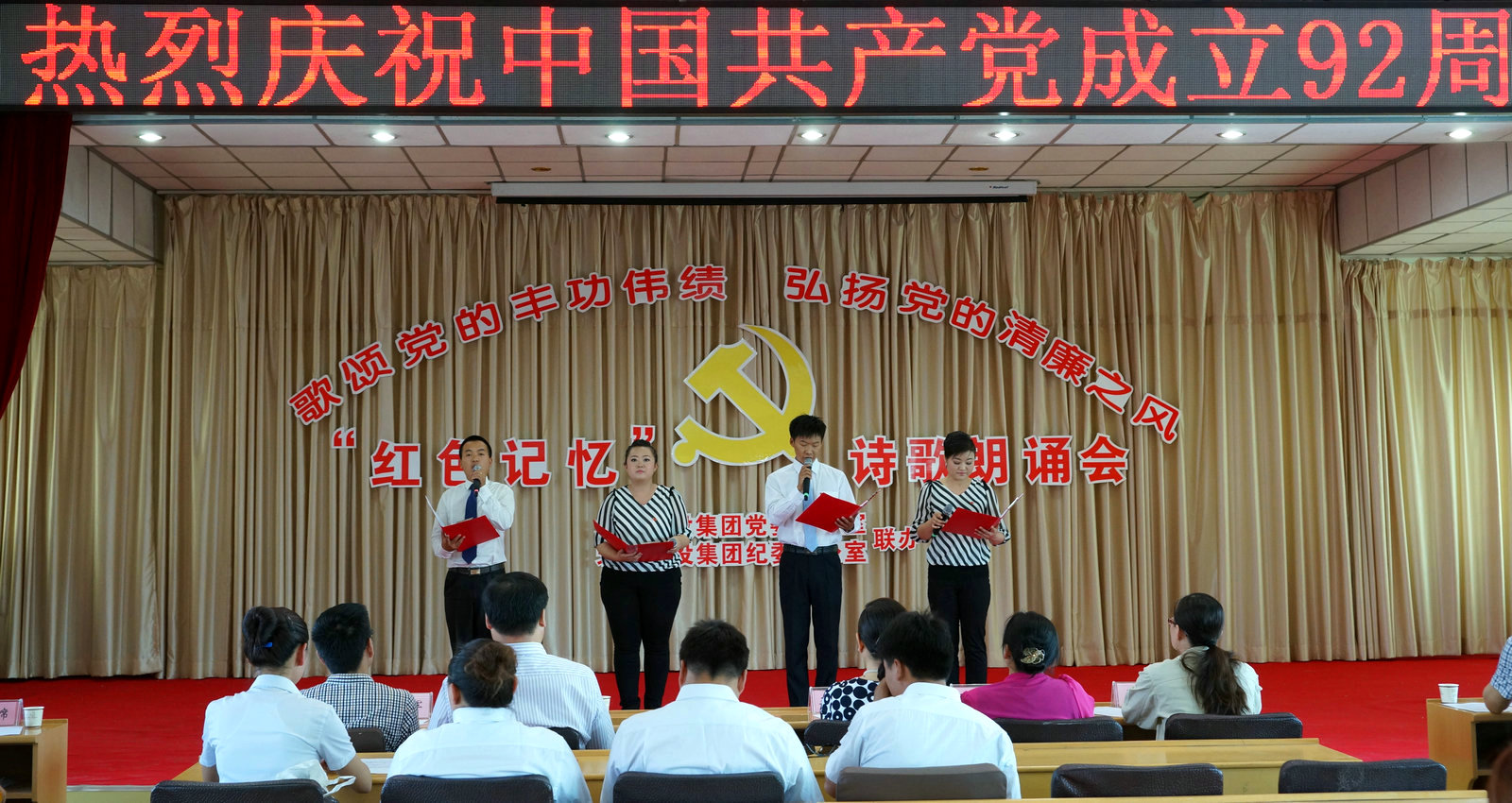 在主持人激情洋溢的介紹中,詩(shī)歌朗誦會(huì )正式開(kāi)始,來(lái)自機關(guān)和各分公司共十三支隊伍參加了此次比賽,比賽中,每一支參賽隊伍都精神飽滿(mǎn),激情昂揚,熱情洋溢的表達了對中國共產(chǎn)黨的熱愛(ài)和肺腑的祝福。讓人眼前一亮的是機關(guān)參賽的這四名選手,他們聲音洪亮,感情豐富,而他們在結束時(shí)唱響的《沒(méi)有共產(chǎn)黨就沒(méi)有新中國》更是贏(yíng)得了現場(chǎng)熱烈的掌聲。